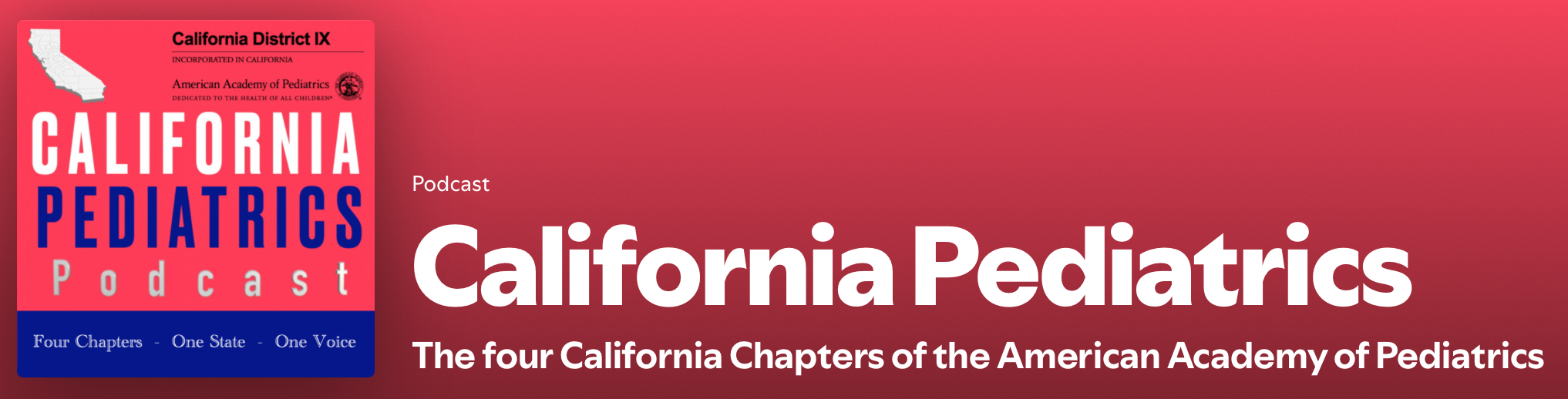 Streaming on Amazon Music/Audible, Apple Podcasts, iHeart Radio, Spotify and YouTube! California Pediatrics is a podcast by pediatricians from the four California chapters of the American Academy of Pediatrics presenting current affairs, highlights on career paths, and tips for parents. This project is funded by the AAP Healthy People 2030 grant. Produced by Chapter 2 Executive Director Tomás Torices, MD. Search for California Pediatrics on your favorite podcast platform, or visit our platform on Libsyn.